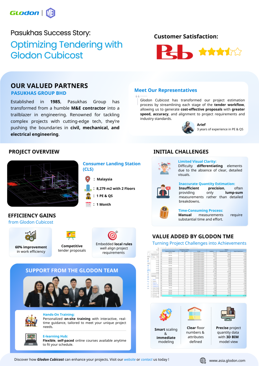 Established in 1985, Pasukhas Group Bhd has grown from a modest Mechanical and Electrical (M&E) contractor to a recognized leader in civil, mechanical, and electrical engineering. As their portfolio grew in complexity, so did their need for a solution that could match their pace and uphold quality standards. Glodon’s technology offered the precise alignment Pasukhas needed, helping them streamline tendering processes and achieve results that set them apart in the industry.