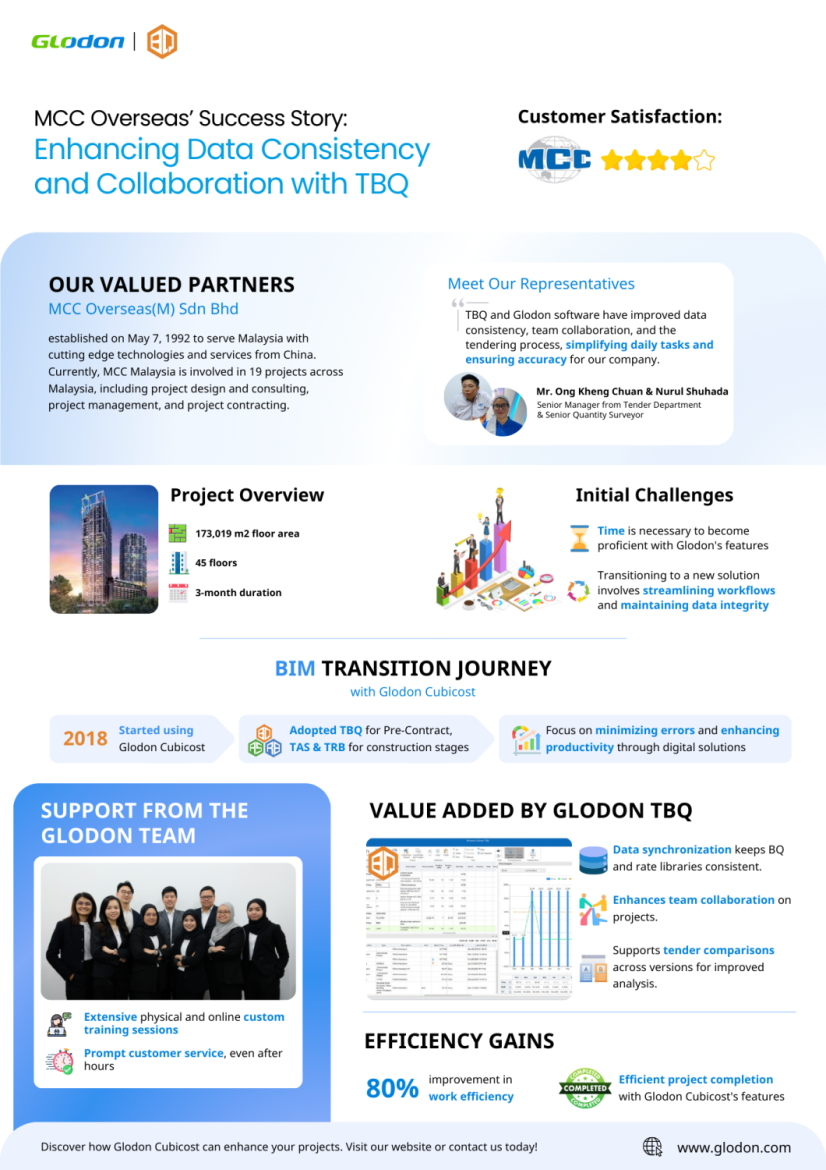 This blog article highlights the significant improvements MCC Overseas experienced through their partnership with Glodon TBQ. By ensuring data consistency and enhancing team collaboration, MCC Overseas successfully streamlined their workflows, resulting in substantial efficiency gains. Explore the full infographic and watch the video interview to hear directly from their representatives about this transformative journey.
